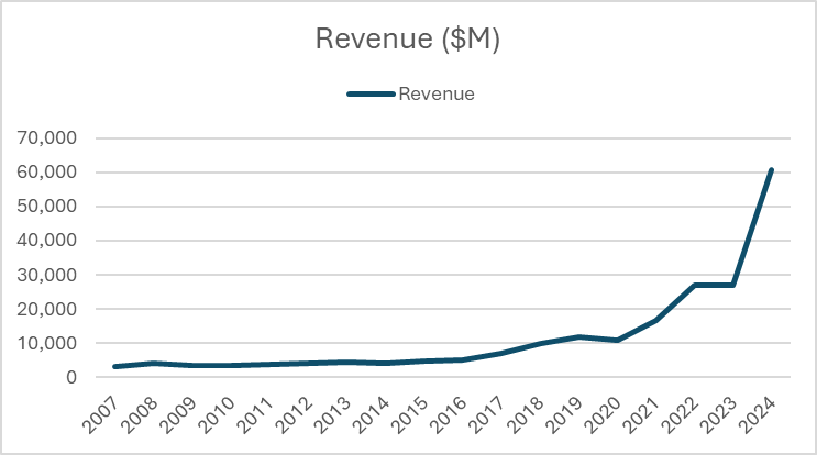 Nvidia has experienced an immense amount of revenue growth in the past year. Many believe the revenue growth is from the boom in AI use. The truth is, the revenue explosion is from the growth in the use of data centers. As businesses transition to using cloud based servers and software, the need for data centers and the powerful GPUs are on a rise. Nvidia provides about 80% of the global GPU market, giving them an a clear advantage moving forward.